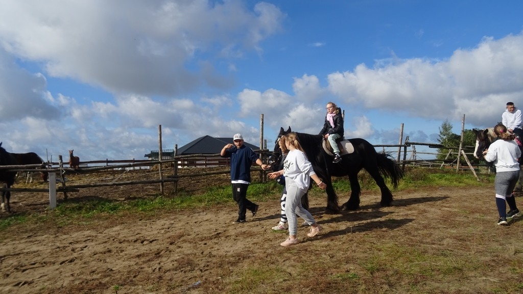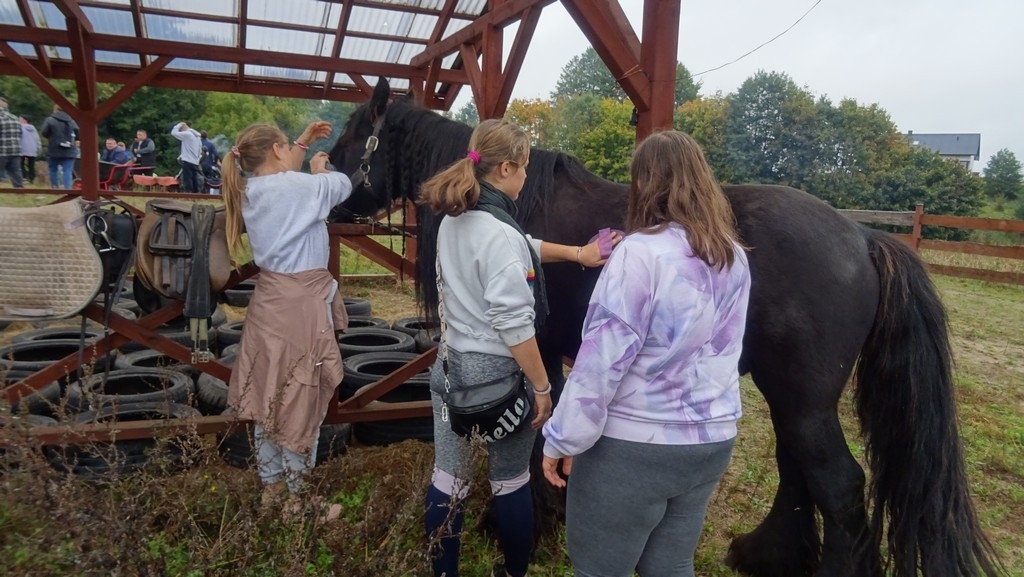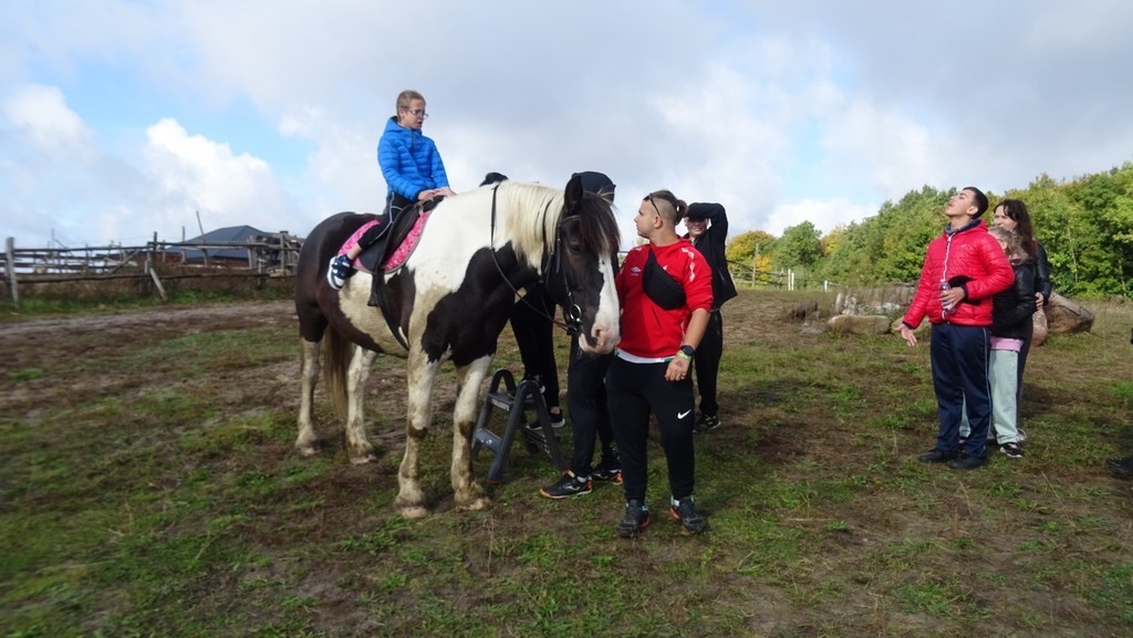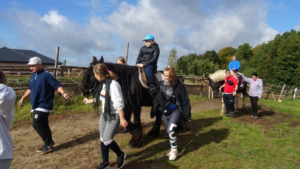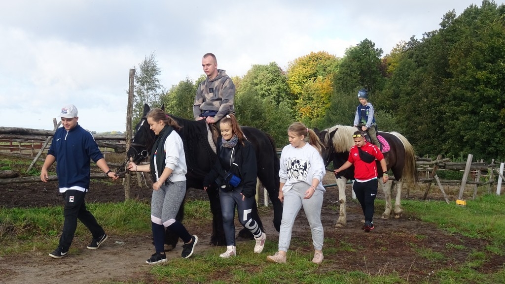W dniu 9 października 2025 r. zorganizowany został wyjazd do Ośrodka Rehabilitacji i Rekreacji Konnej do Jastrzębiu k/Lipna, gdzie w zajęciach terapeutycznych wzięło udział 36 uczniów, w tym 6-cioro nowych uczniów Ośrodka, dla których było to bardzo niezwykłe doznanie- obcowanie z koniem, możliwość dotykania zwierzęcia, przygotowania go do jazdy konnej, głaskanie, przytulanie. Po przygotowaniach koni do jazdy były przejażdżki konne, wspólna organizacja ogniska i pieczenie kiełbasek. Mnóstwo radości i nieskrępowanego luzu przysporzyła uczniom zabawa na belach słomy i zajęcia porządkowe w stajni i w jej obejściu.