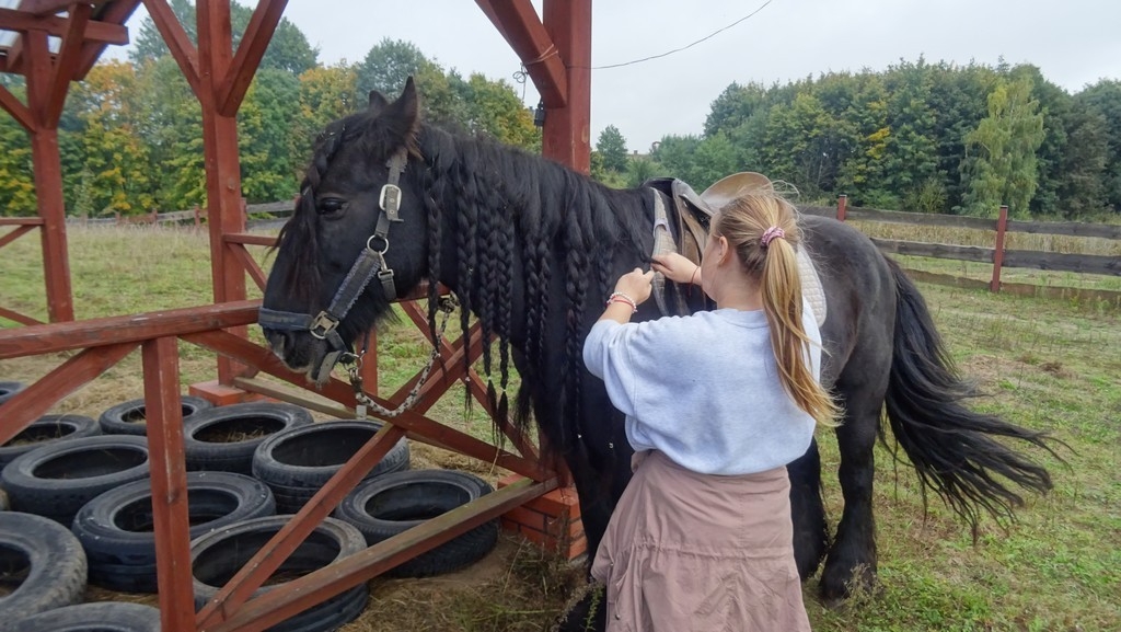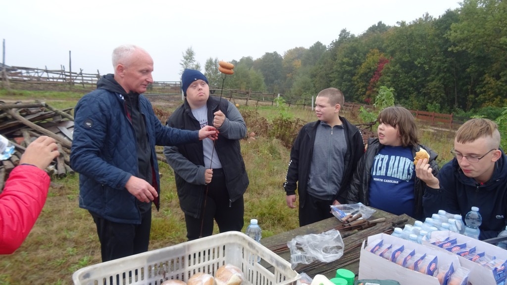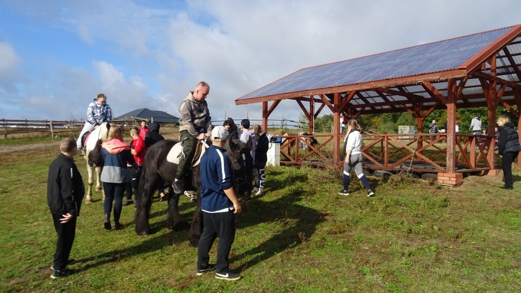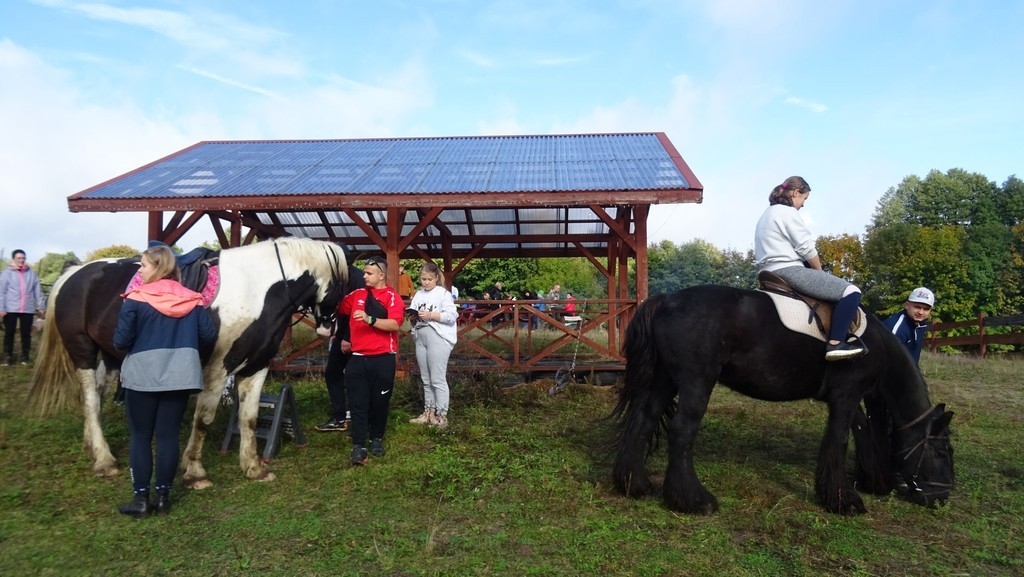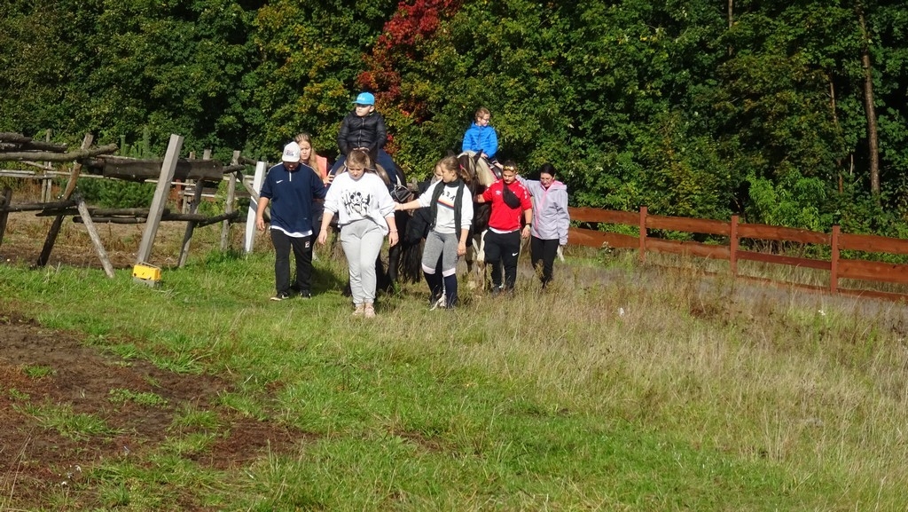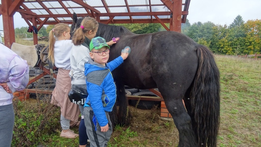 W dniu 9 października 2025 r. zorganizowany został wyjazd do Ośrodka Rehabilitacji i Rekreacji Konnej do Jastrzębiu k/Lipna, gdzie w zajęciach terapeutycznych wzięło udział 36 uczniów, w tym 6-cioro nowych uczniów Ośrodka, dla których było to bardzo niezwykłe doznanie- obcowanie z koniem, możliwość dotykania zwierzęcia, przygotowania go do jazdy konnej, głaskanie, przytulanie. Po przygotowaniach koni do jazdy były przejażdżki konne, wspólna organizacja ogniska i pieczenie kiełbasek. Mnóstwo radości i nieskrępowanego luzu przysporzyła uczniom zabawa na belach słomy i zajęcia porządkowe w stajni i w jej obejściu.