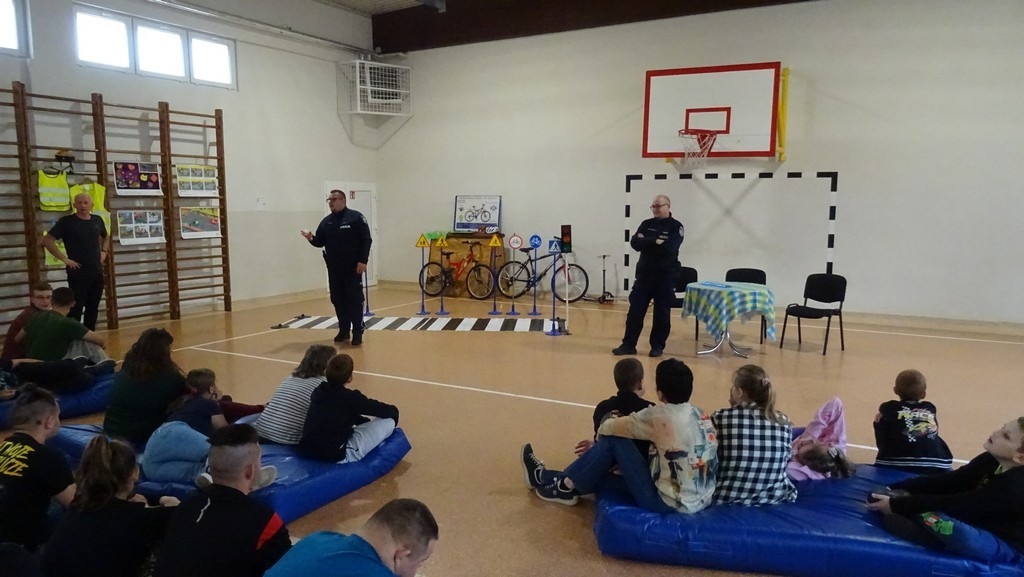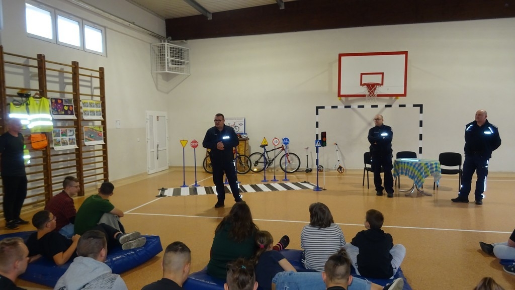 To wszystko sprawia, że na wspólnym spotkaniu z policjantami z Komendy Powiatowej Policji w Golubiu-Dobrzyniu, dzielnicowymi asp. szt. Krzysztofem Smolińskim, asp. Piotrem Sipakiem i asp. Marcinem Muchewiczem zwrócono uwagę uczniów na zagadnienia związane z poruszaniem się po drogach poza obszarem zabudowanym i w obrębie miast, przypomniano dzieciom jak należy przechodzić zgodnie z przepisami po przejściu dla pieszych z sygnalizatorem świetlnym i bez niego. Ukazano dzieciom skuteczność działania i ochronę, jaką dla pieszych daje noszenie materiałów odblaskowych. Panowie Policjanci wręczyli wszystkim uczniom opaski odblaskowe z zaleceniem codziennego stosowania.